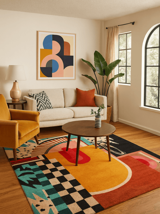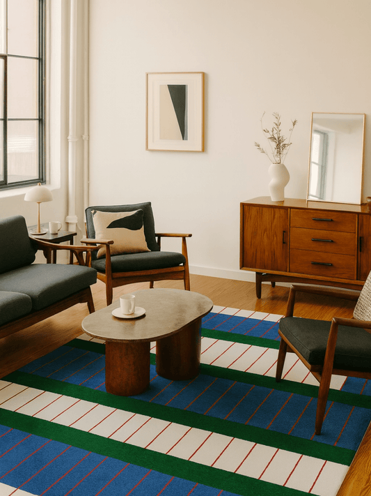 Associer un tapis coloré avec des meubles neutres pour créer un contraste élégant.